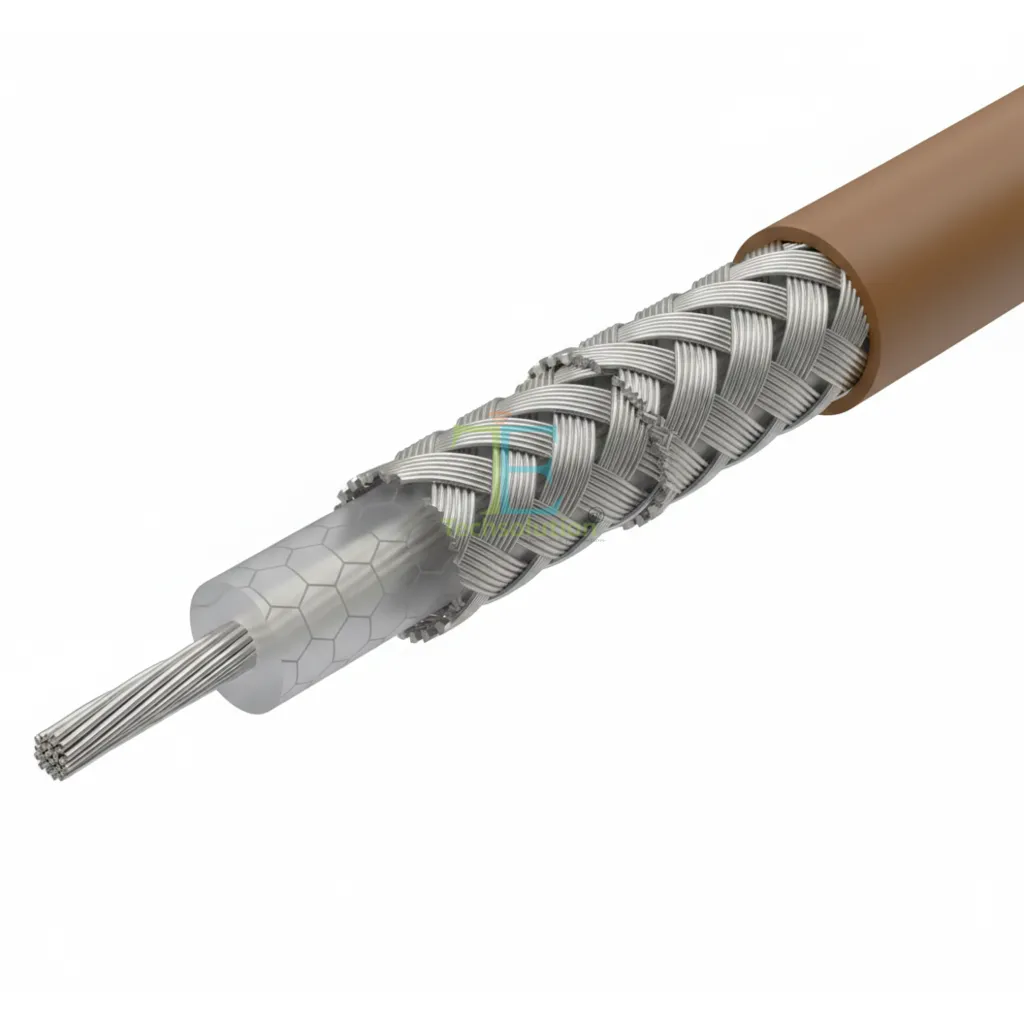 This coaxial cable is designed for high-performance signal transmission with excellent shielding effectiveness and low loss.It features silver-plated conductors, dual braided shielding, and a durable brown FEP jacket for reliable use in demanding applications. Technical Specifications Cable Type: Coaxial Cable Impedance: Colour: Brown Inner Conductor: Silver-plated copper wire, diameter Dielectric: Solid PTFE, 2.95 mm diameter First Outer Shield: Silver-plated copper wire braiding, 3.60 mm diameter Second Outer Shield: Silver-plated copper wire braiding, 4.19 mm diameter Outer Jacket: FEP (Brown), 4.95 mm overall diameter