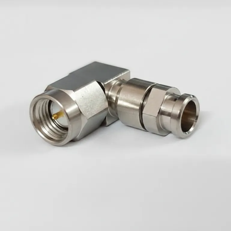 The SMA Right-Angle Plug Connector is designed for solder termination on 0.142″ semi-rigid cables, featuring a robust stainless steel body for corrosion resistance and long-lasting mechanical strength. Its gold-plated center contact ensures reliable 50 Ω RF performance with minimal signal loss.